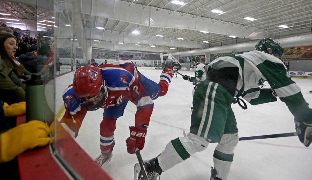 Marshfield’s Kyle Bossey, left, is defended by Natick’s James Dempsey throughout a boys hockey conflict. Marshfield received, 3-1. (Employees picture by Stuart Cahill)