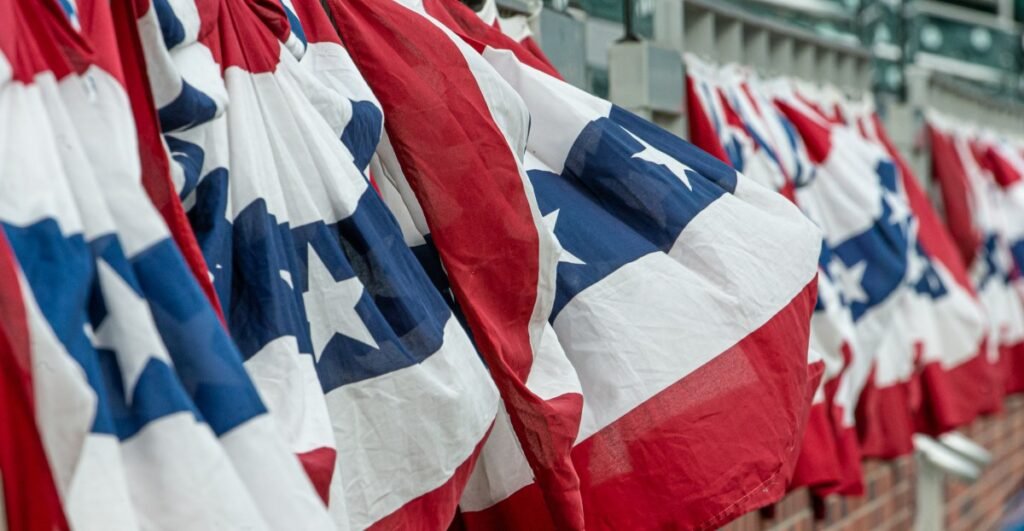 ATLANTA, GA – APRIL 10: Patriotic bunting hanging from the concourse previous to the MLB recreation between the Philadelphia Phillies and Atlanta Braves on April 10, 2021, at Truist Park in Atlanta, GA. (Picture by John Adams/Icon Sportswire through Getty Photographs) | Icon Sportswire through Getty Photographs